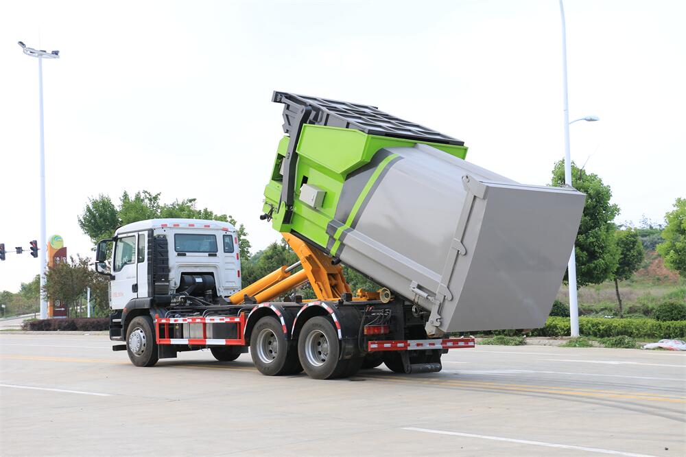 該款鉤臂式垃圾車由液壓系統(tǒng)、操作系統(tǒng)組成。舉升油制缸(1支)系國內知名液壓件廠家生產的雙作用油缸。垃圾廂可自吊上放下,可自行傾倒垃圾,上下一次工作循環(huán)時間≤50S。該車的特點是一個車能配多個垃圾廂,能實現(xiàn)一臺車與多個垃圾廂聯(lián)合作業(yè),循環(huán)運輸,充分提高了車輛的運輸能力。