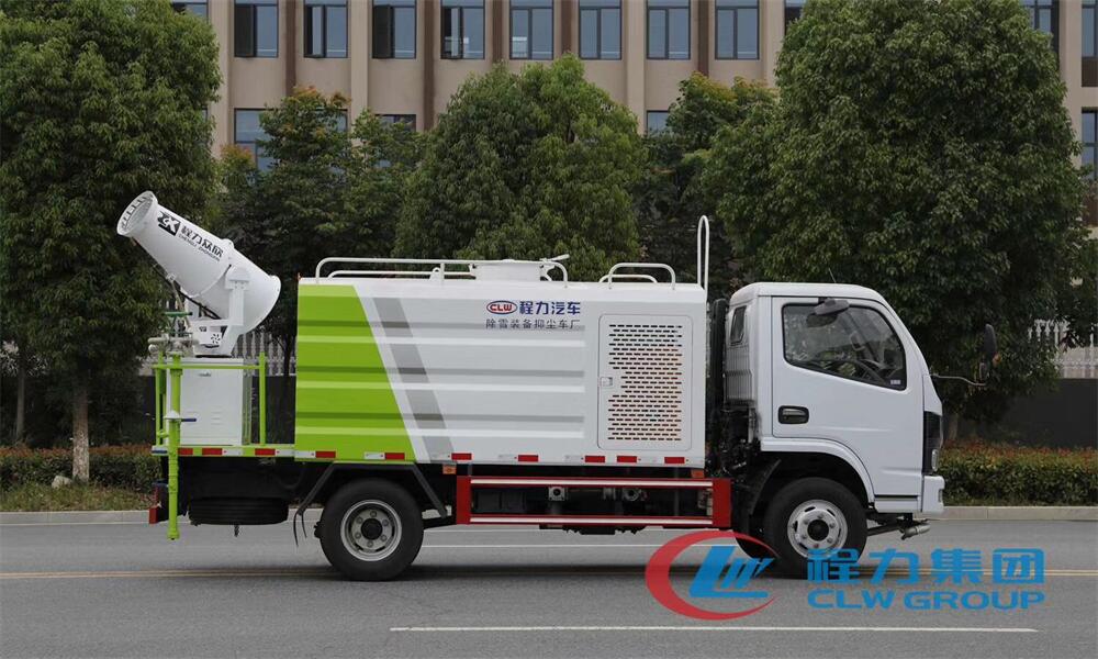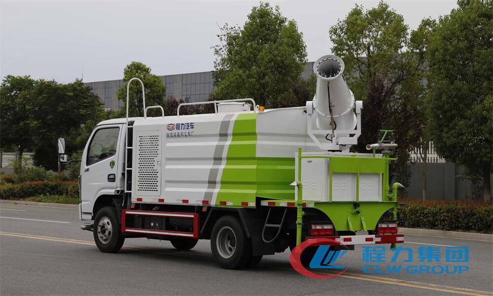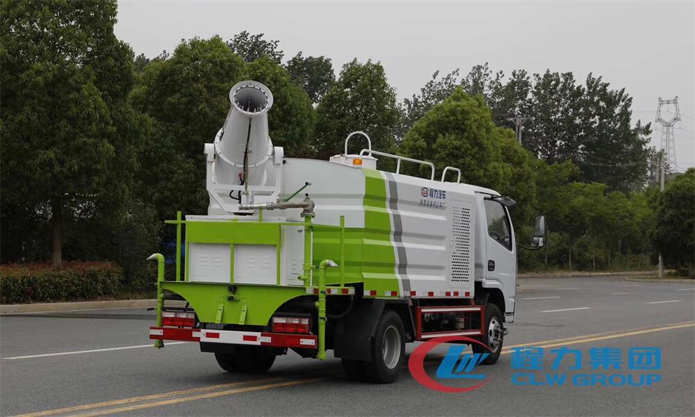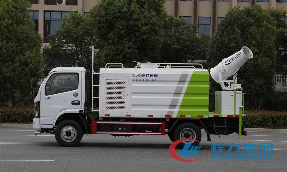 上裝配置:罐體容積為 5-7立方,選配風送式霧炮機組射程30米、40米、50米、60米、80米、100米、120米霧炮,罐體鋼板為4mm碳鋼Q235材質,罐內隔板具有防波作用,以減輕汽車行駛時罐體液體沖擊,罐體及整車外形尺寸按照公告。帶大功率專用灑水泵,泵可自吸自排,整車前沖、后灑、側噴、帶65消防接口,后平臺配CLW-50、CLW-60、CLW-80、CLW-100、CLW-120型風送式霧炮機組;罐體前封頭配大功率柴油發(fā)電機組;前封頭帶水位計,后平臺主管路帶1寸澆花接口,后爬梯。帶兩根輸水管及陰陽端。罐體顏色:銀/灰/綠,罐體兩側噴“多功能抑塵車”字樣,貼反光標示。